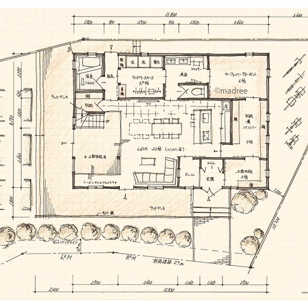 全国の建築家から間取りが集まるmadree(マドリー)で集まった3LDKの間取りです。外とつながるLDKやアウトドアリビングが特徴の注文住宅の間取りです。