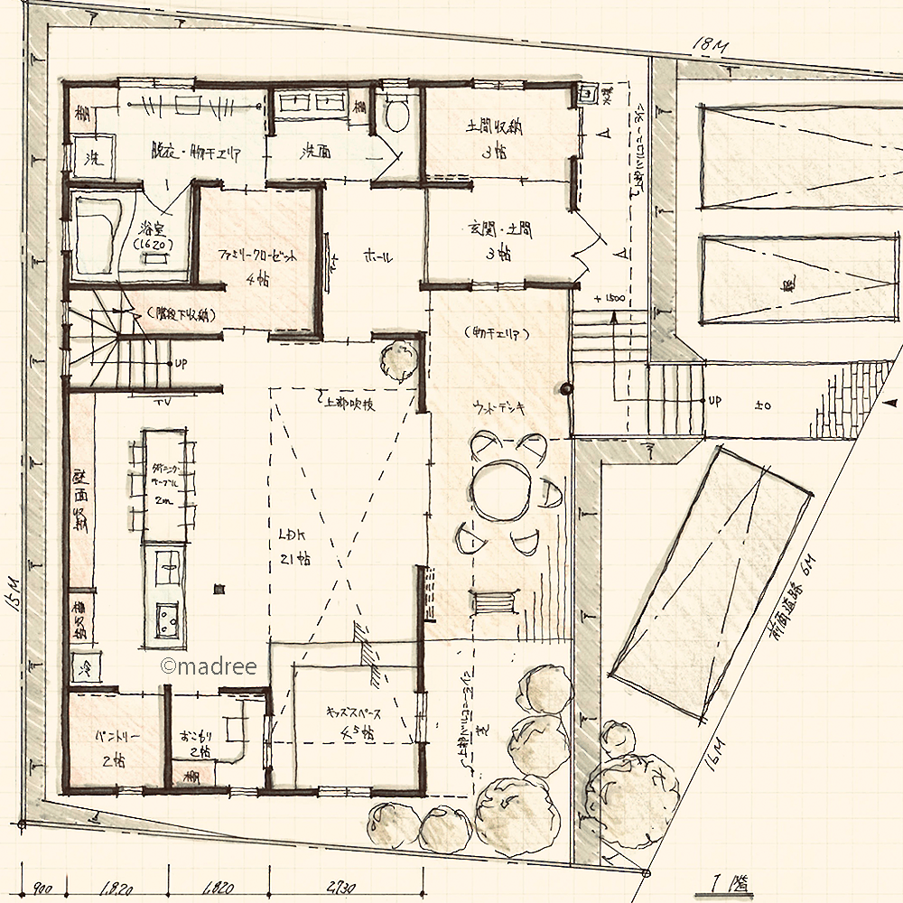 全国の建築家から間取りが集まるmadree(マドリー)で集まった47坪、4LDKの間取りです。外とつながるLDKやアウトドアリビングが特徴の注文住宅の間取りです。