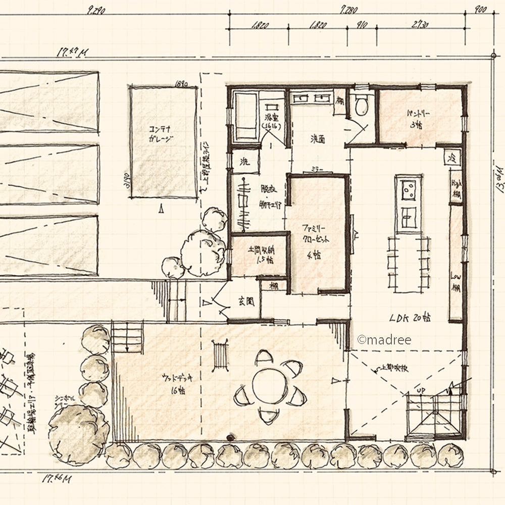 全国の建築家から間取りが集まるmadree(マドリー)で集まった40坪、2LDKの間取りです。外とつながるLDKやアウトドアリビングが特徴の注文住宅の間取りです。