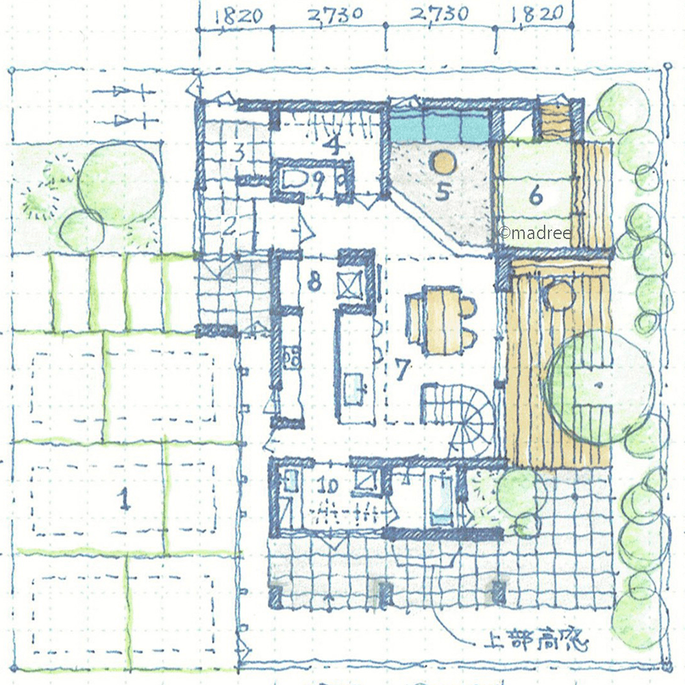 全国の建築家から間取りが集まるmadree(マドリー)で集まった33坪、2LDKの間取りです。外とつながるLDKやアウトドアリビングが特徴の注文住宅の間取りです。