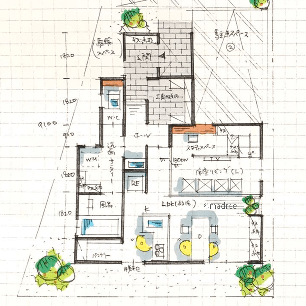 全国の建築家から間取りが集まるmadree(マドリー)で集まった26坪、3LDKの間取りです。外とつながるLDKや南向きバルコニーが特徴の注文住宅の間取りです。