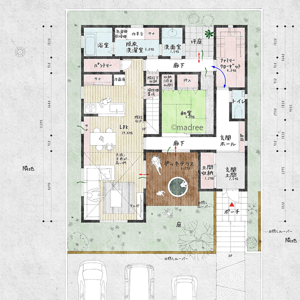 全国の建築家から間取りが集まるmadree(マドリー)で集まった42坪、2LDKの間取りです。外とつながるLDKやアウトドアリビングが特徴の注文住宅の間取りです。
