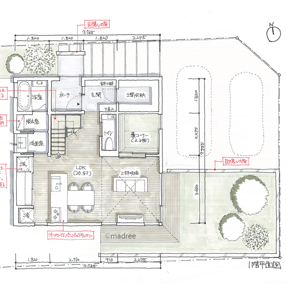 全国の建築家から間取りが集まるmadree(マドリー)で集まった33坪、4LDKの間取りです。外とつながるLDKやアウトドアリビングが特徴の注文住宅の間取りです。