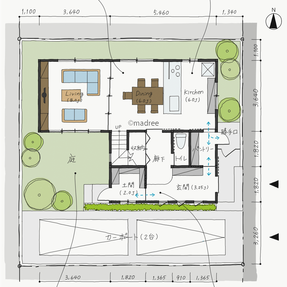 全国の建築家から間取りが集まるmadree(マドリー)で集まった32坪、2LDKの間取りです。L+DKやプライバシー守るが特徴の注文住宅の間取りです。