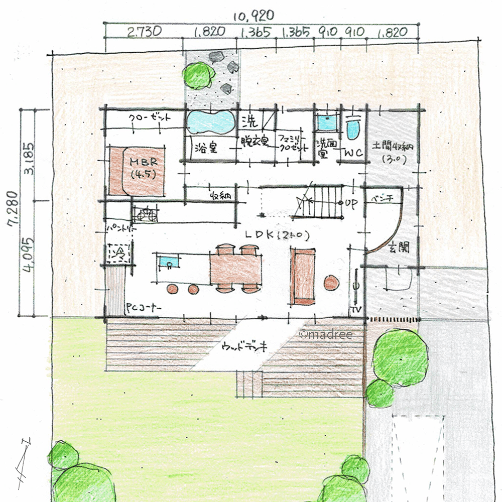 全国の建築家から間取りが集まるmadree(マドリー)で集まった33坪、2LDKの間取りです。外とつながるLDKやアウトドアリビングが特徴の注文住宅の間取りです。