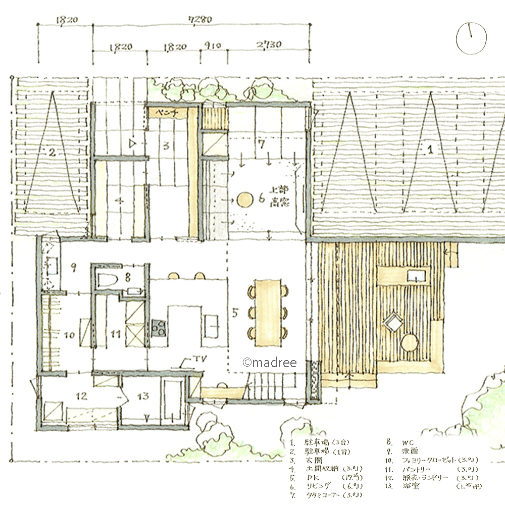 全国の建築家から間取りが集まるmadree(マドリー)で集まった39坪、3LDKの間取りです。外とつながるLDKやアウトドアリビングが特徴の注文住宅の間取りです。