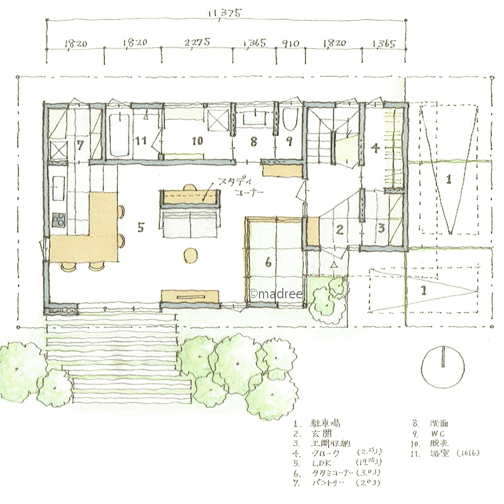 全国の建築家から間取りが集まるmadree(マドリー)で集まった40坪、3LDKの間取りです。広く感じるLDKやリビング一体の畳が特徴の注文住宅の間取りです。