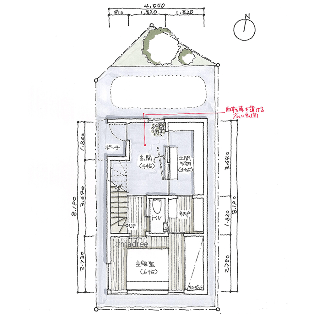 全国の建築家から間取りが集まるmadree(マドリー)で集まった32坪、3LDKの間取りです。外とつながるLDKや2階リビングが特徴の注文住宅の間取りです。