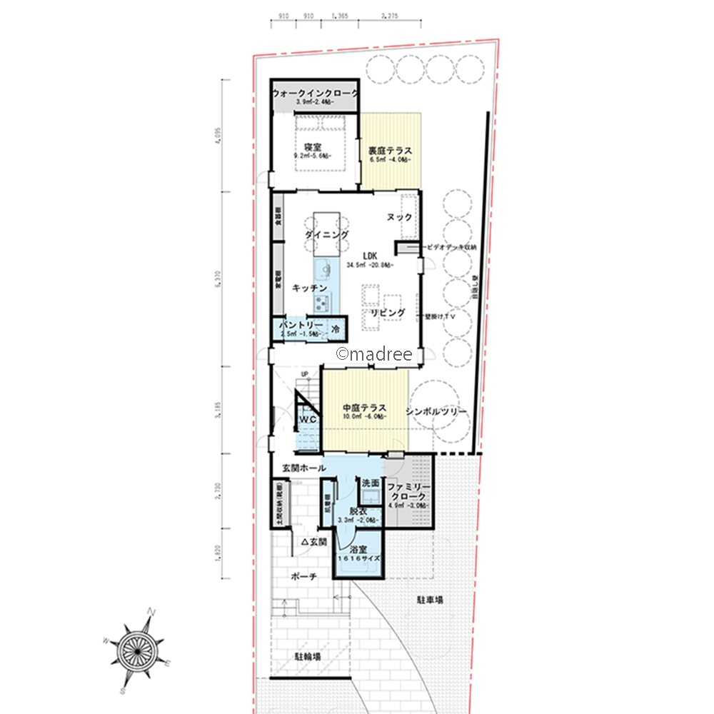 全国の建築家から間取りが集まるmadree(マドリー)で集まった32坪、4LDKの間取りです。外とつながるLDKやアウトドアリビングが特徴の注文住宅の間取りです。