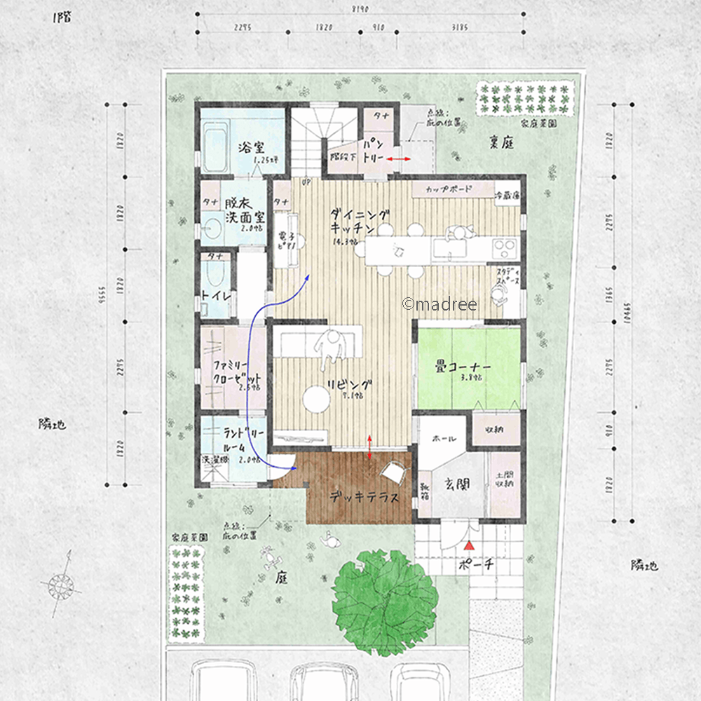 [43坪 5LDK] 一直線の裏動線で家事効率UP、かけがえのない家族時間をつくるママ目線の注文住宅の間取り