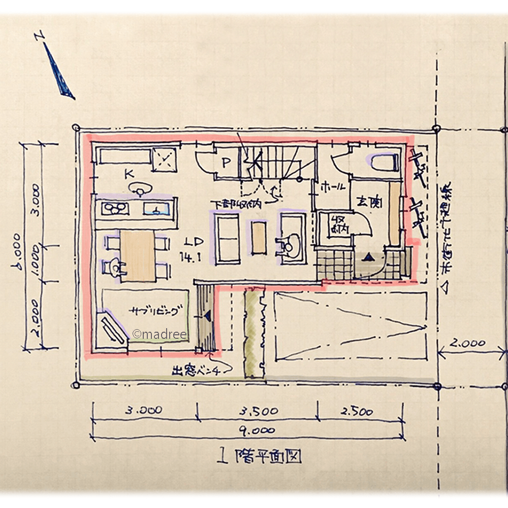 全国の建築家から間取りが集まるmadree(マドリー)で集まった24坪、セカンドリビングの間取りです。外とつながるLDKや広く感じるLDKが特徴の注文住宅の間取りです。