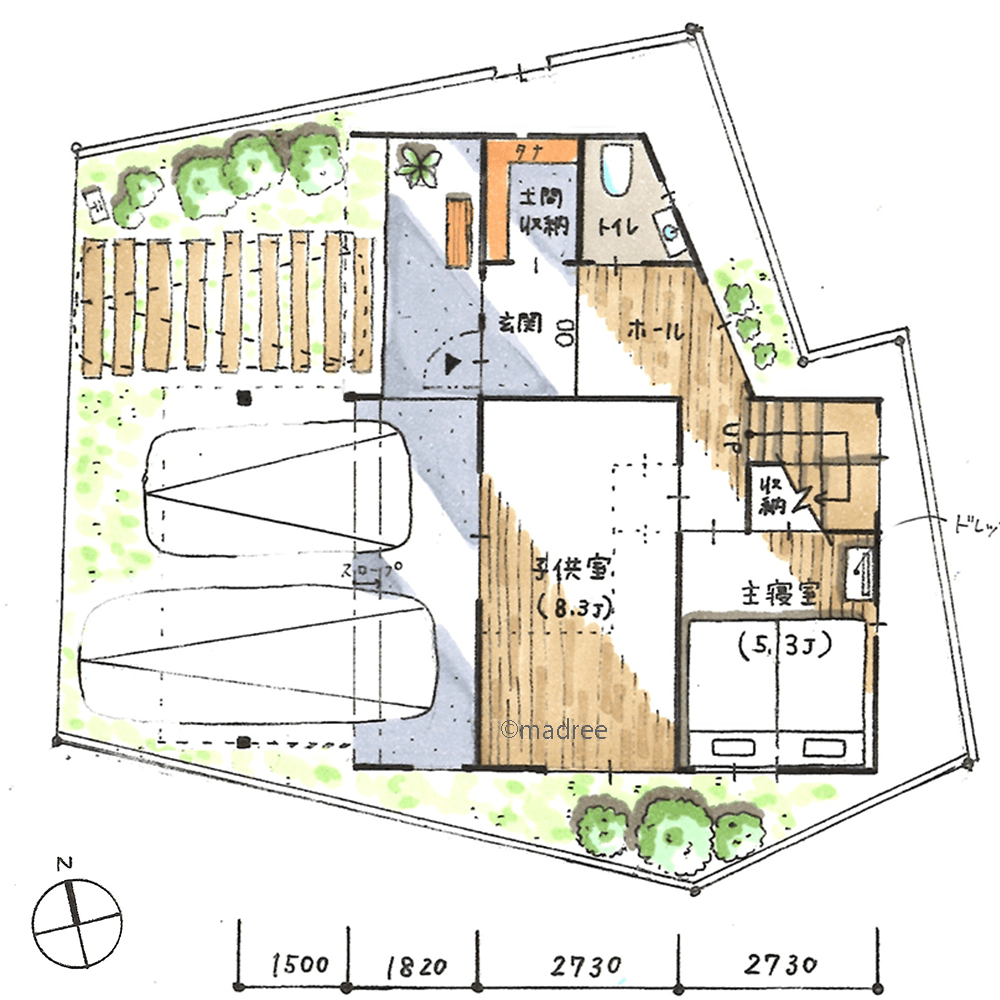 全国の建築家から間取りが集まるmadree(マドリー)で集まった27坪〜30坪、3LDKの間取りです。外とつながるLDKやアウトドアリビングが特徴の注文住宅の間取りです。