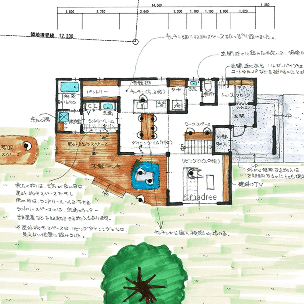 全国の建築家から間取りが集まるmadree(マドリー)で集まった50坪、4LDKの間取りです。外とつながるLDKやアウトドアリビングが特徴の注文住宅の間取りです。