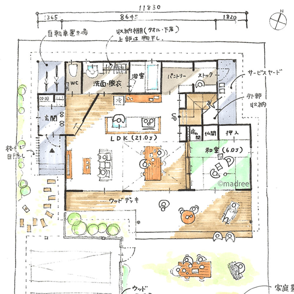 全国の建築家から間取りが集まるmadree(マドリー)で集まった35坪、3LDKの間取りです。外とつながるLDKやアウトドアリビングが特徴の注文住宅の間取りです。