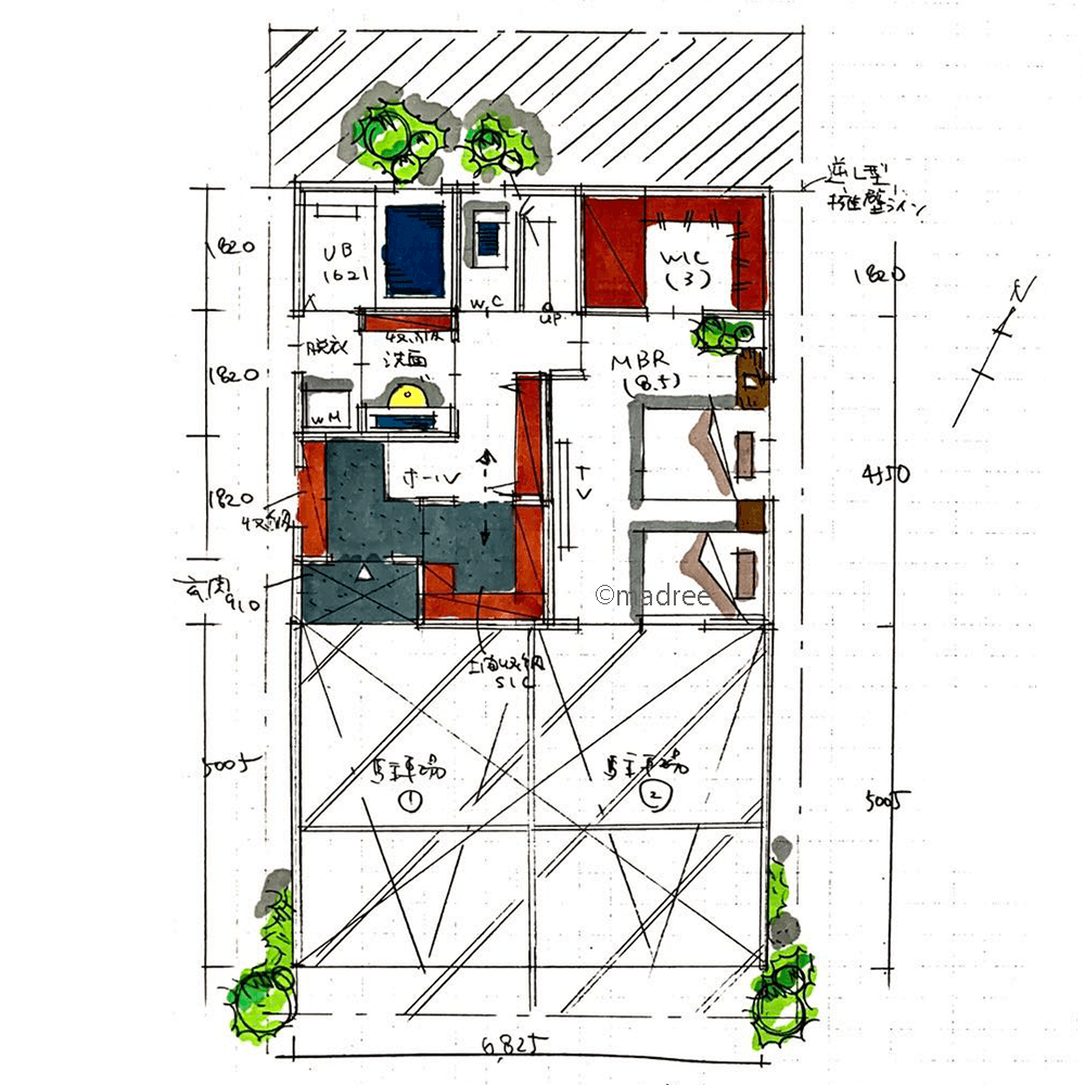 全国の建築家から間取りが集まるmadree(マドリー)で集まった33坪、4LDKの間取りです。外とつながるLDKやアウトドアリビングが特徴の注文住宅の間取りです。