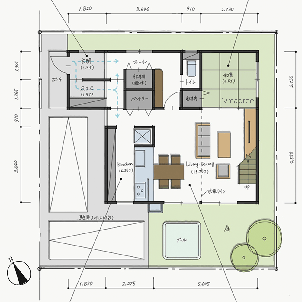 ・隣地建物などの影響により日の当たりにくい部分がありますが、なるべく建物を北側に寄せ、南側をオープンにすることで採光が入りやすくなるよう配置しています。そのまま南側を庭とし、西側に駐車スペースを2台分つなげた配置計画としています。