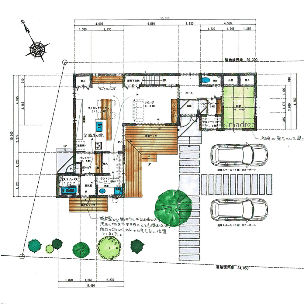 全国の建築家から間取りが集まるmadree(マドリー)で集まった41坪、4LDKの間取りです。外とつながるLDKやアウトドアリビングが特徴の注文住宅の間取りです。