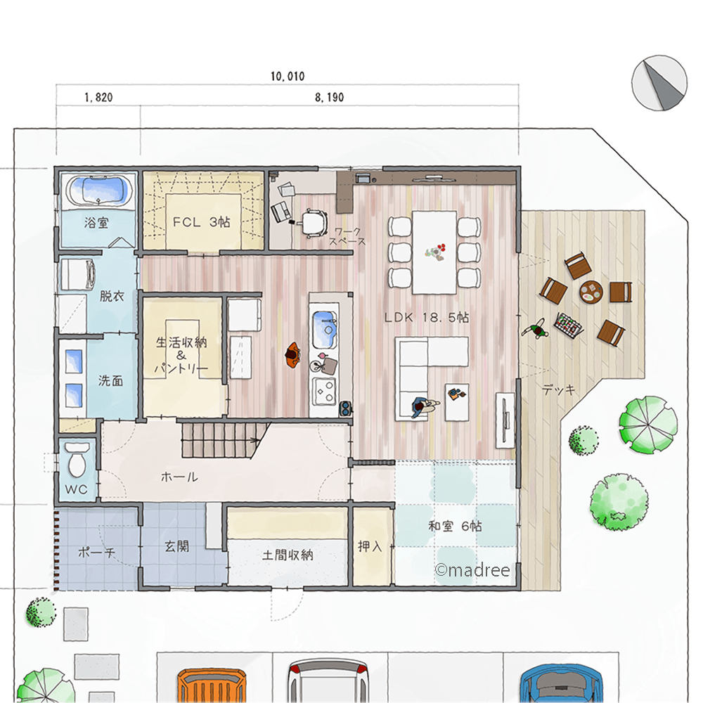 全国の建築家から間取りが集まるmadree(マドリー)で集まった41坪、5LDKの間取りです。外とつながるLDKやアウトドアリビングが特徴の注文住宅の間取りです。