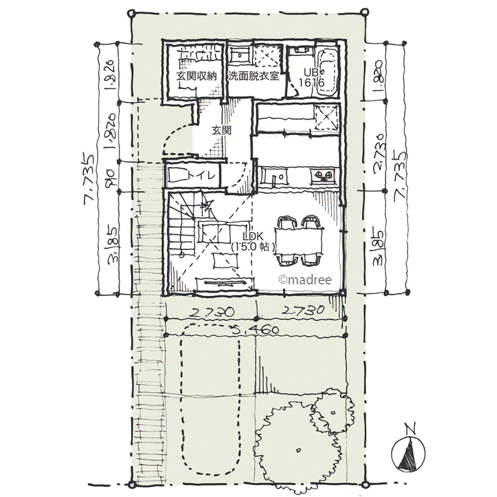 全国の建築家から間取りが集まるmadree(マドリー)で集まった22坪、2LDKの間取りです。外とつながるLDKやアウトドアリビングが特徴の注文住宅の間取りです。