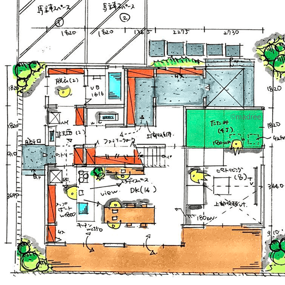 全国の建築家から間取りが集まるmadree(マドリー)で集まった39坪、3LDKの間取りです。外とつながるLDKやアウトドアリビングが特徴の注文住宅の間取りです。