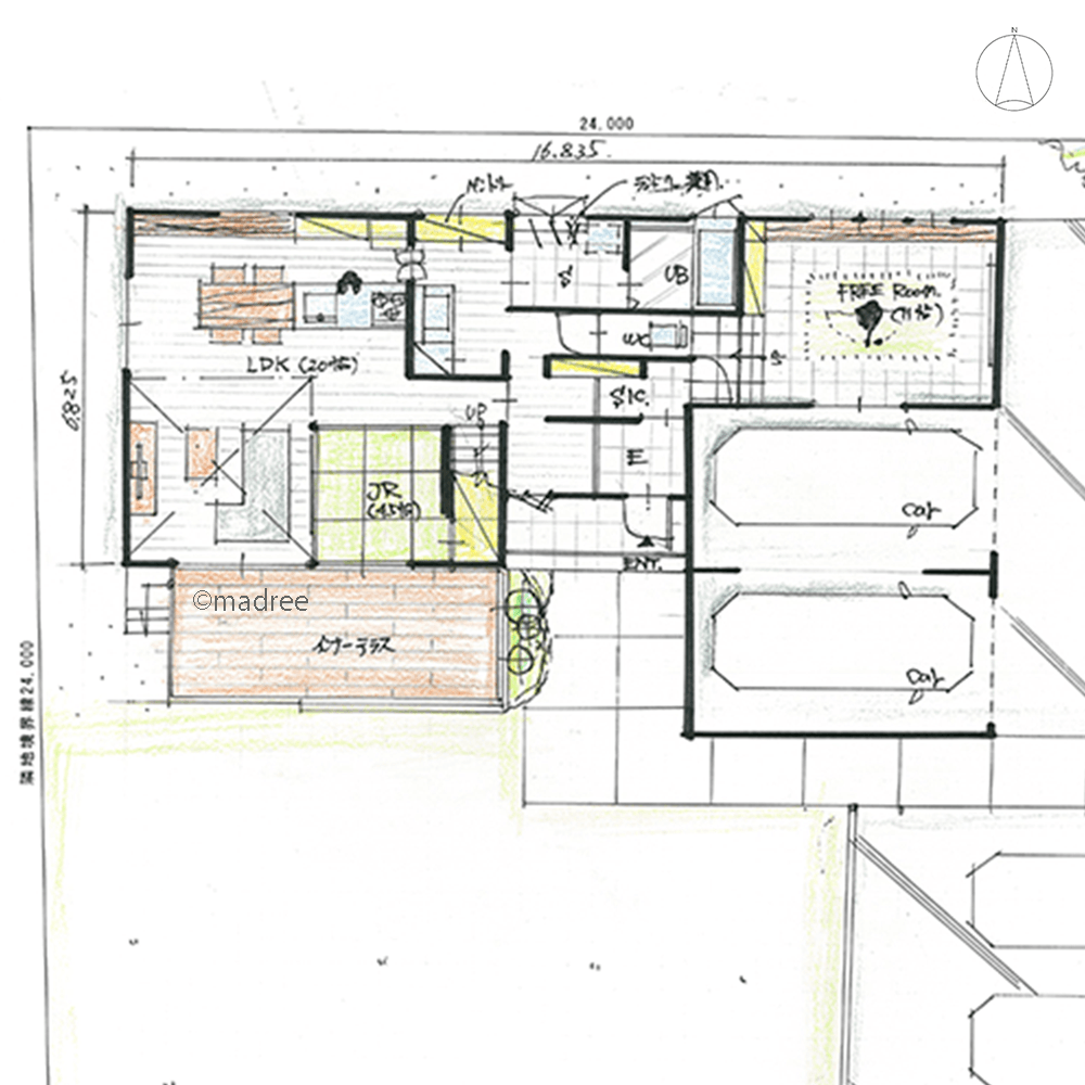 全国の建築家から間取りが集まるmadree(マドリー)で集まった45坪、5LDKの間取りです。アウトドアリビングやリビング吹抜が特徴の注文住宅の間取りです。