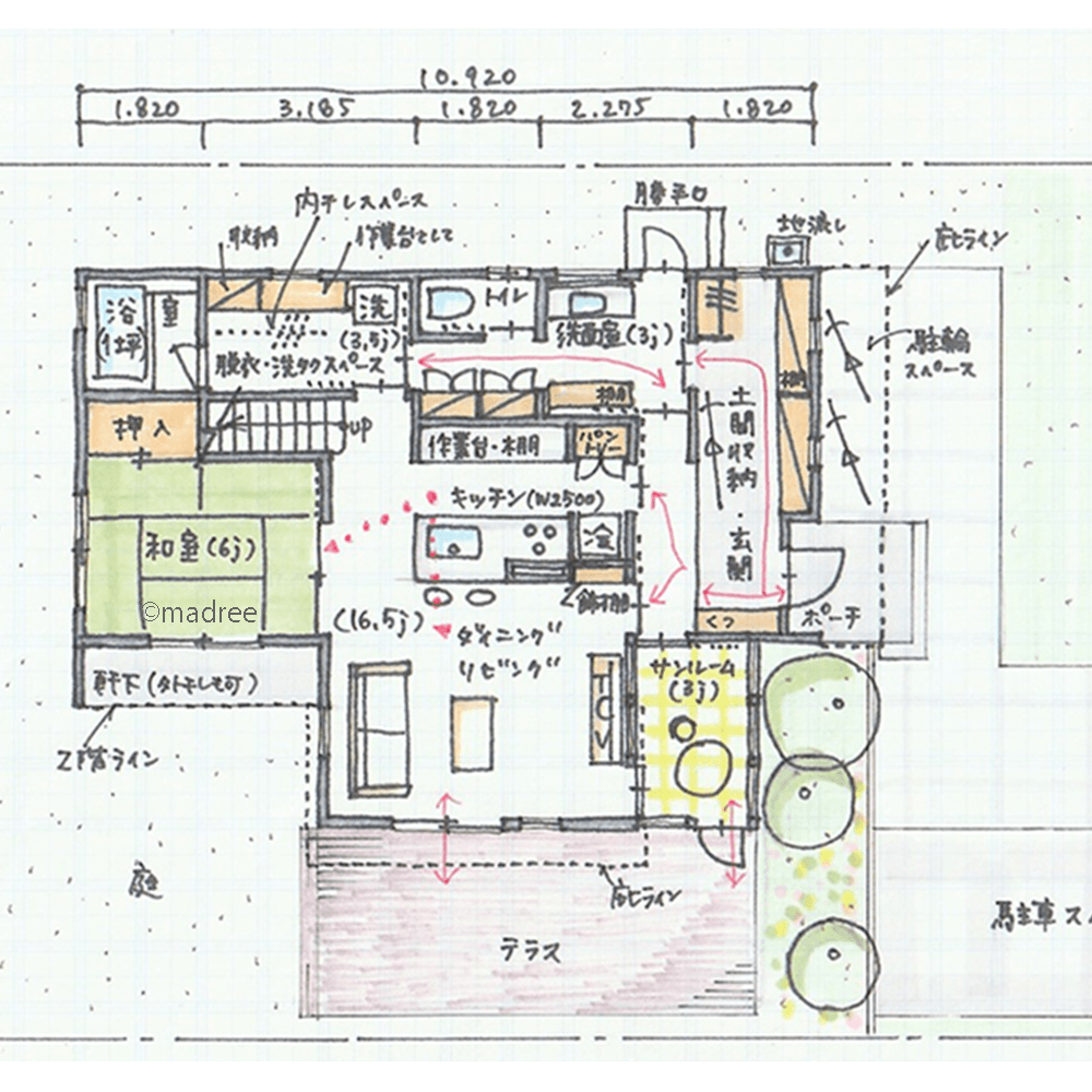 全国の建築家から間取りが集まるmadree(マドリー)で集まった38坪、4LDKの間取りです。外とつながるLDKやアウトドアリビングが特徴の注文住宅の間取りです。