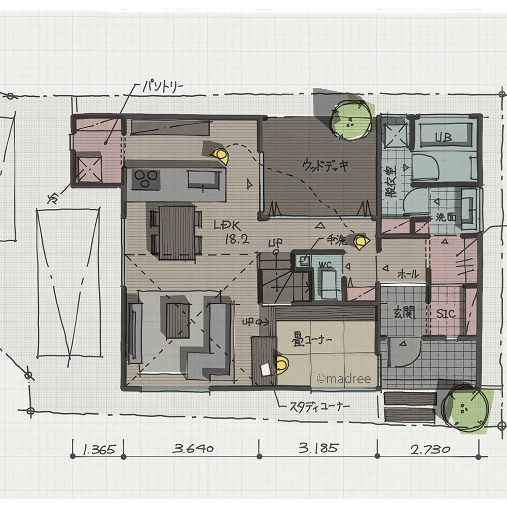 全国の建築家から間取りが集まるmadree(マドリー)で集まった30坪、3LDKの間取りです。外とつながるLDKやアウトドアリビングが特徴の注文住宅の間取りです。