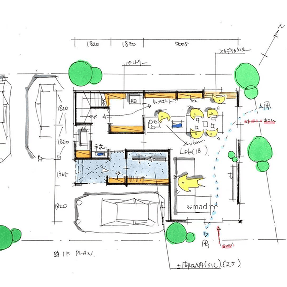 全国の建築家から間取りが集まるmadree(マドリー)で集まった27坪〜30坪、2LDKの間取りです。プライバシー守るやバルコニーが特徴の注文住宅の間取りです。