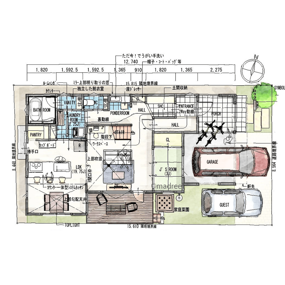 ・エントランスからの動線は2way動線として、ホールから直接LDKに続く来客動線と、土間収納とクロークを介する家族の裏動線を設けました。