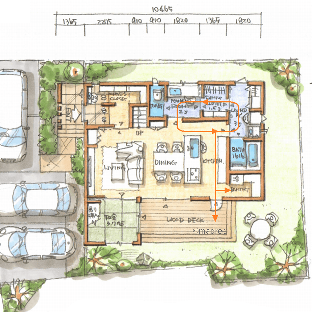 全国の建築家から間取りが集まるmadree(マドリー)で集まった31坪、3LDKの間取りです。外とつながるLDKやアウトドアリビングが特徴の注文住宅の間取りです。