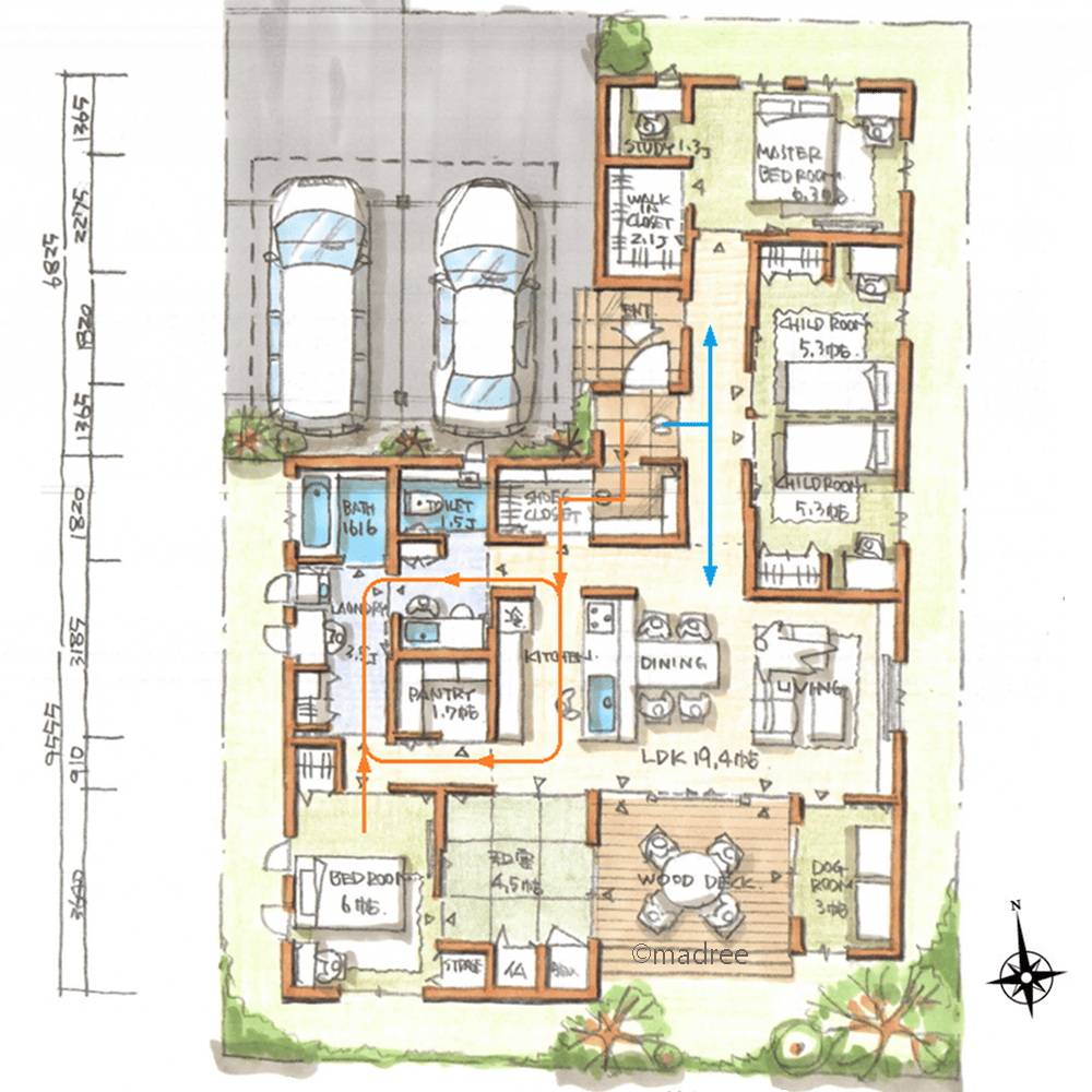 全国の建築家から間取りが集まるmadree(マドリー)で集まった38坪、4LDKの間取りです。外とつながるLDKやアウトドアリビングが特徴の注文住宅の間取りです。