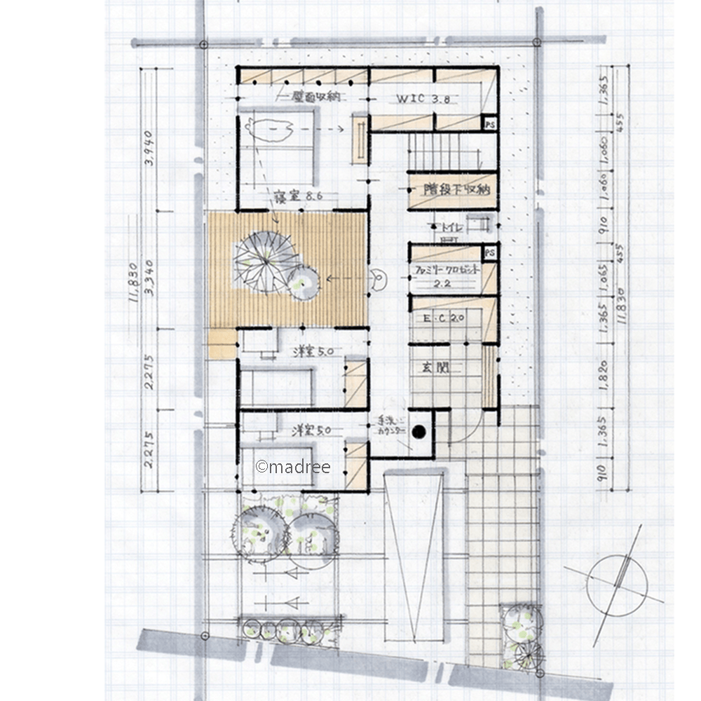 ・南北に長い土地形状を活かして中庭を配置し、各居室への採光を確保しました。
