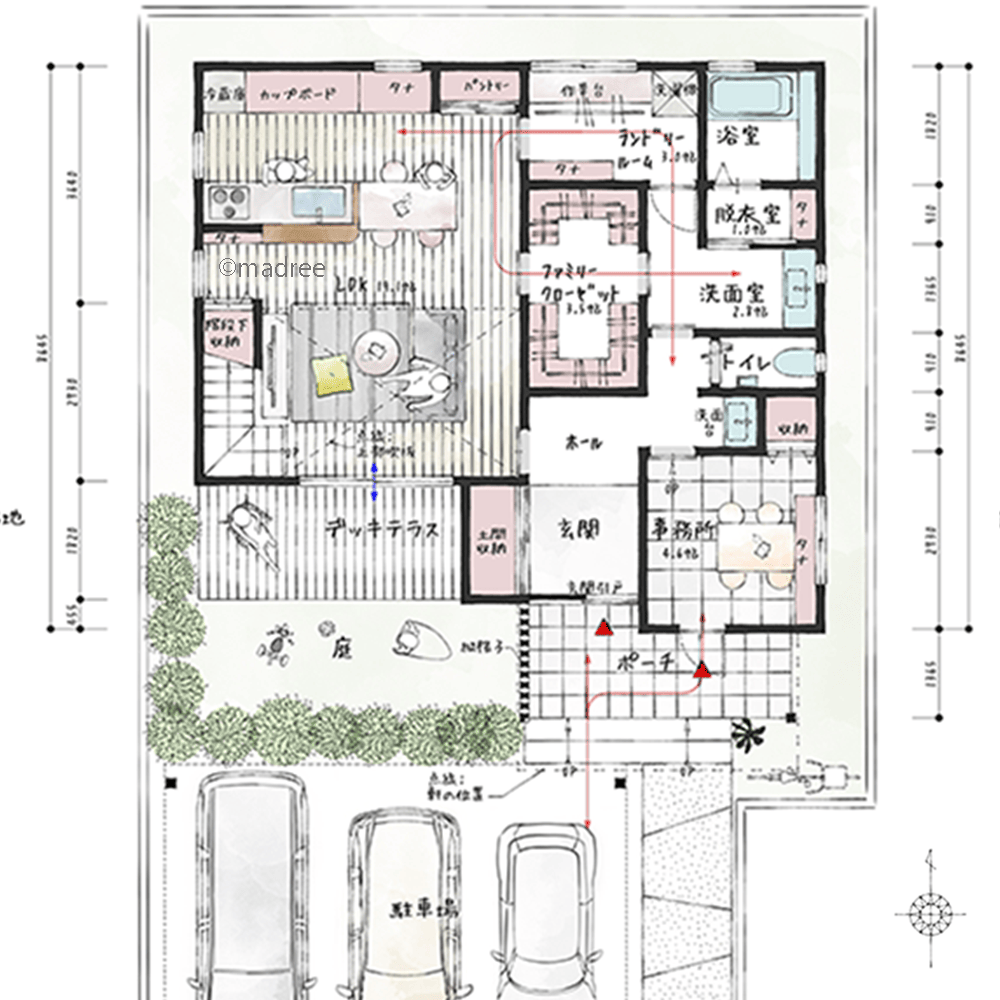 全国の建築家から間取りが集まるmadree(マドリー)で集まった36坪、3LDKの間取りです。外とつながるLDKやアウトドアリビングが特徴の注文住宅の間取りです。