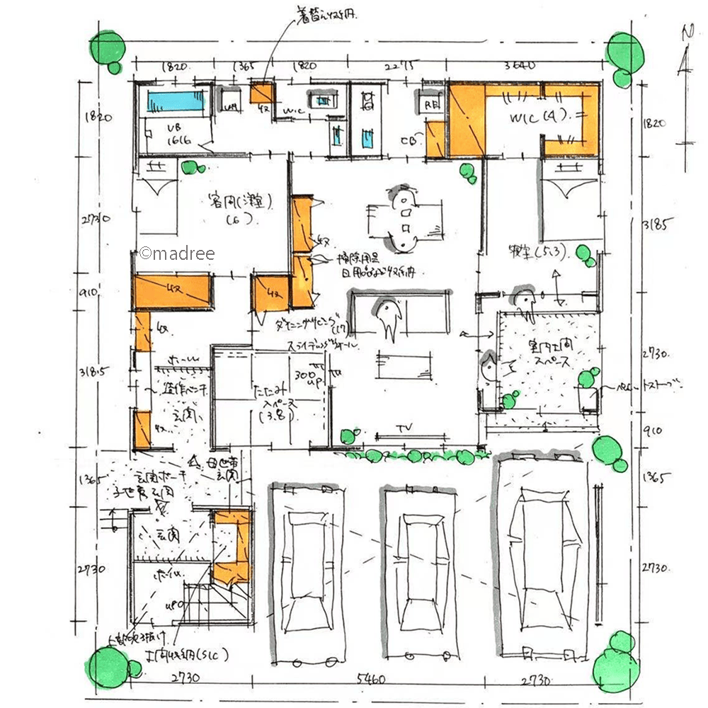 全国の建築家から間取りが集まるmadree(マドリー)で集まった50坪以上、納戸の間取りです。外とつながるLDKやアウトドアリビングが特徴の注文住宅の間取りです。