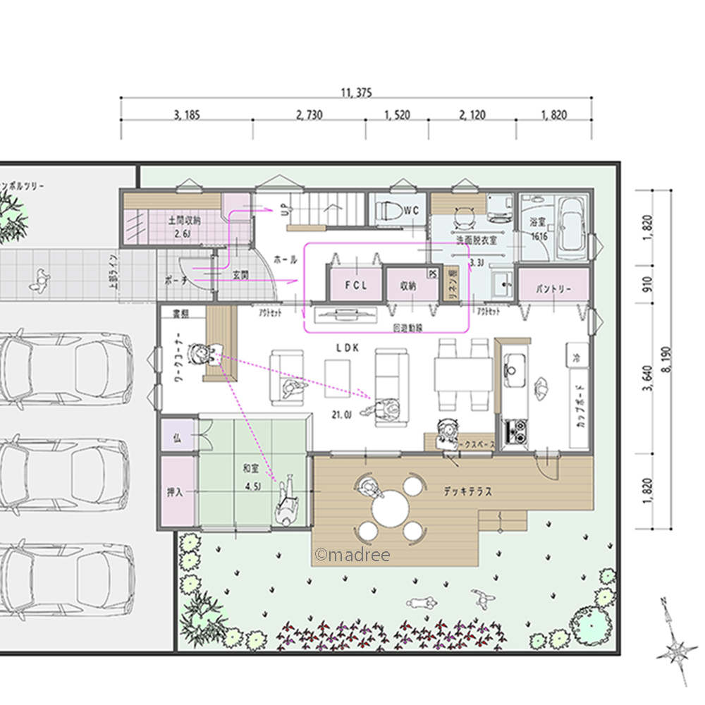 全国の建築家から間取りが集まるmadree(マドリー)で集まった35坪、3LDKの間取りです。外とつながるLDKやアウトドアリビングが特徴の注文住宅の間取りです。