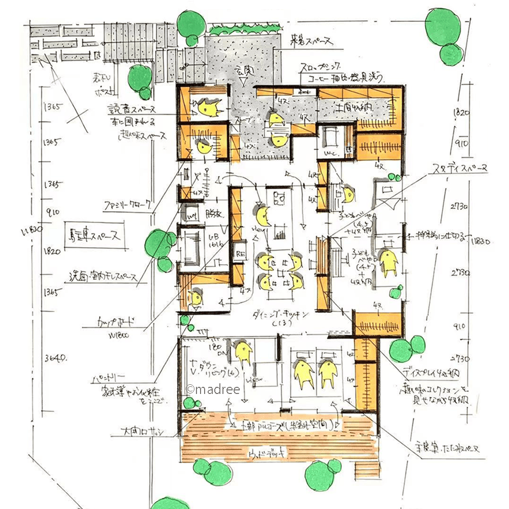 全国の建築家から間取りが集まるmadree(マドリー)で集まった27坪〜30坪、2LDKの間取りです。外とつながるLDKやアウトドアリビングが特徴の注文住宅の間取りです。