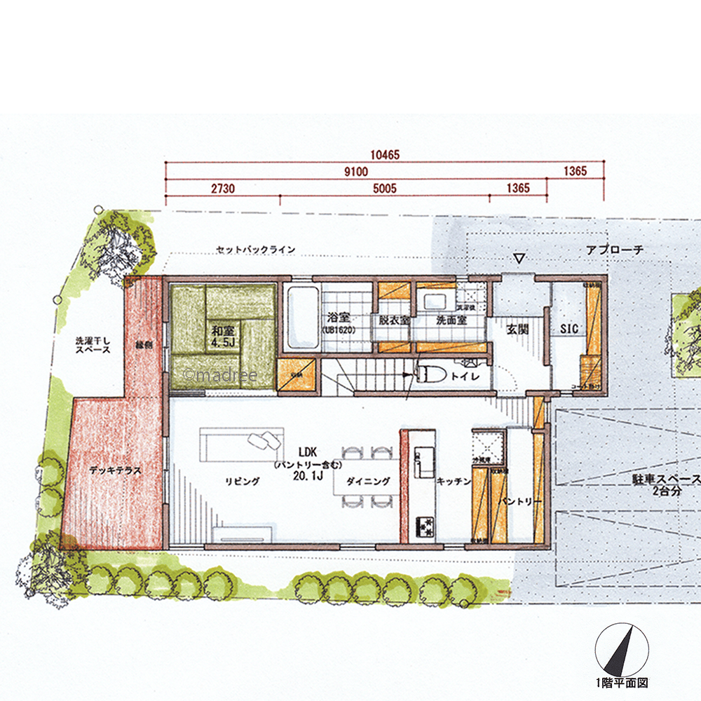 全国の建築家から間取りが集まるmadree(マドリー)で集まった35坪、4LDKの間取りです。外とつながるLDKやアウトドアリビングが特徴の注文住宅の間取りです。