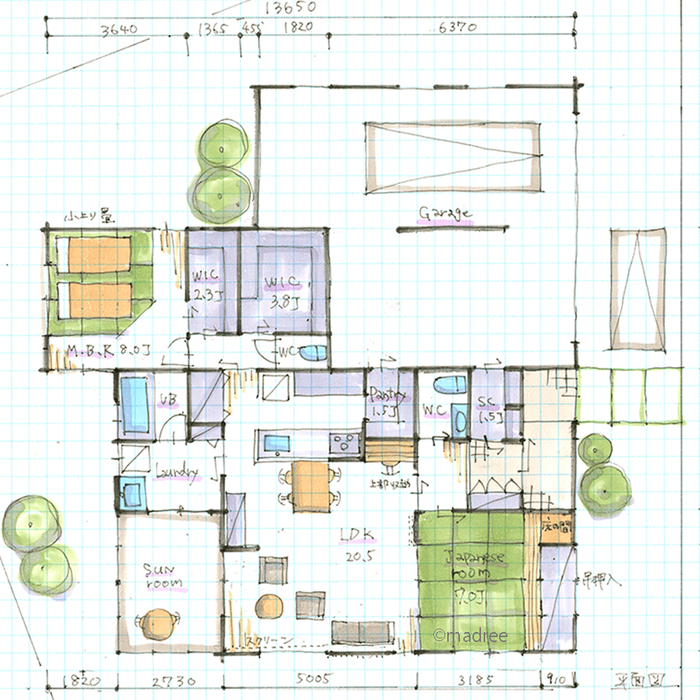 全国の建築家から間取りが集まるmadree(マドリー)で集まった27坪〜30坪、3LDKの間取りです。リビング中心の動線や広く感じるLDKが特徴の注文住宅の間取りです。