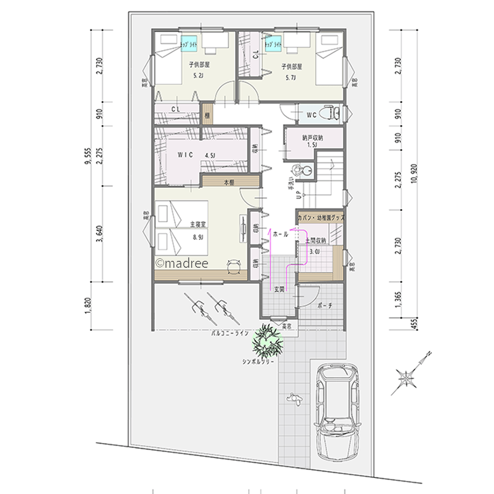全国の建築家から間取りが集まるmadree(マドリー)で集まった44坪、4LDKの間取りです。2階リビングやバルコニーが特徴の注文住宅の間取りです。