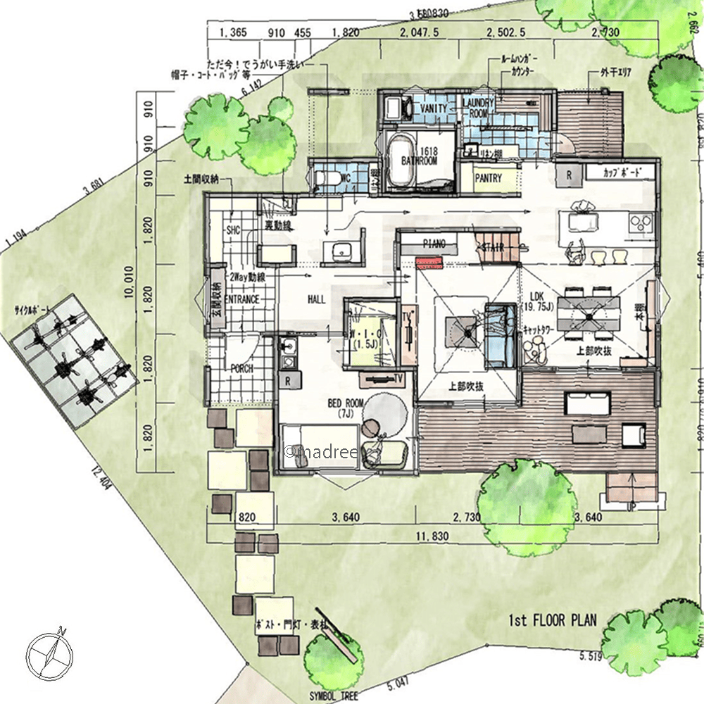 全国の建築家から間取りが集まるmadree(マドリー)で集まった42坪、5LDKの間取りです。外とつながるLDKやアウトドアリビングが特徴の注文住宅の間取りです。