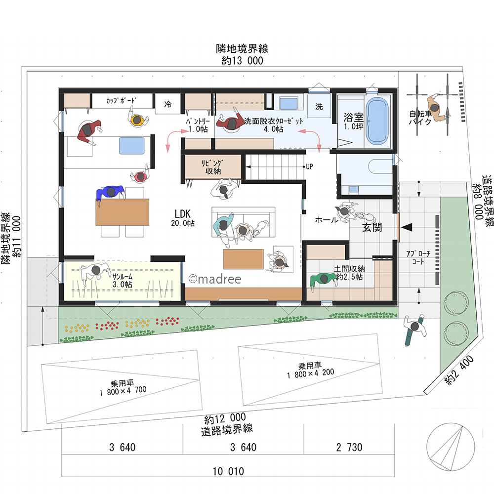 ・車2台の駐車スペースを南に、自転車スペースを北東に配置し、南北双方からアプローチできる玄関としました。