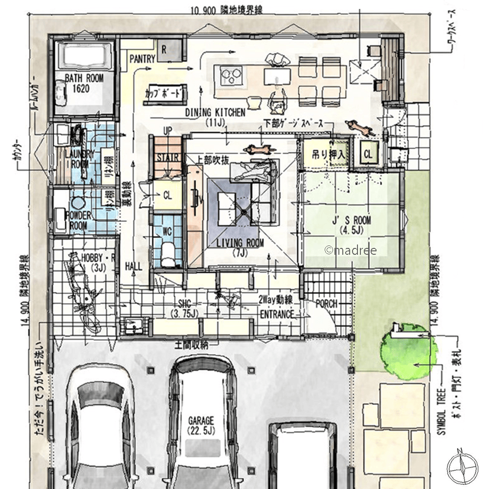 全国の建築家から間取りが集まるmadree(マドリー)で集まった53坪、3LDKの間取りです。外とつながるLDKやリビング吹抜が特徴の注文住宅の間取りです。