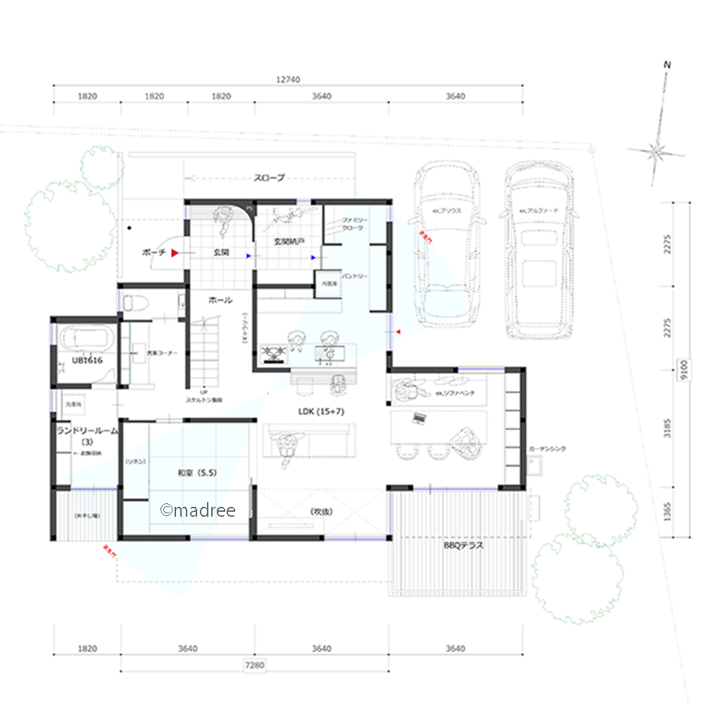 全国の建築家から間取りが集まるmadree(マドリー)で集まった42坪、4LDKの間取りです。外とつながるLDKやアウトドアリビングが特徴の注文住宅の間取りです。