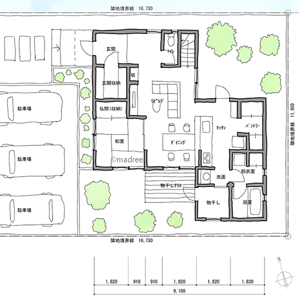 ・要求面積から考えて、敷地に余裕があることが分かりました。家の中や外にたくさんの風景を作りたいので、庭をできるだけ多く作りたいと考えました。
