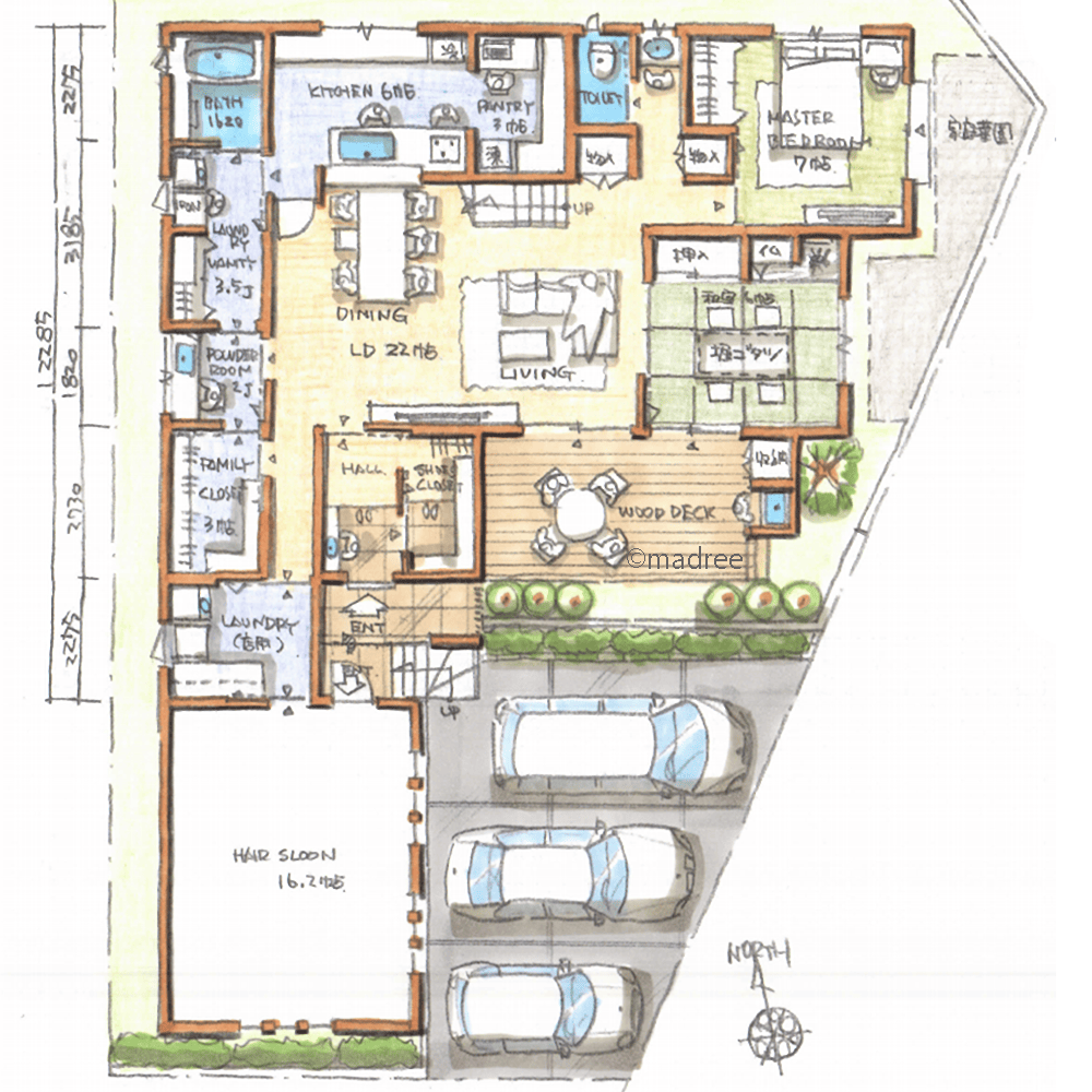 全国の建築家から間取りが集まるmadree(マドリー)で集まった47坪、3LDKの間取りです。外とつながるLDKやアウトドアリビングが特徴の注文住宅の間取りです。
