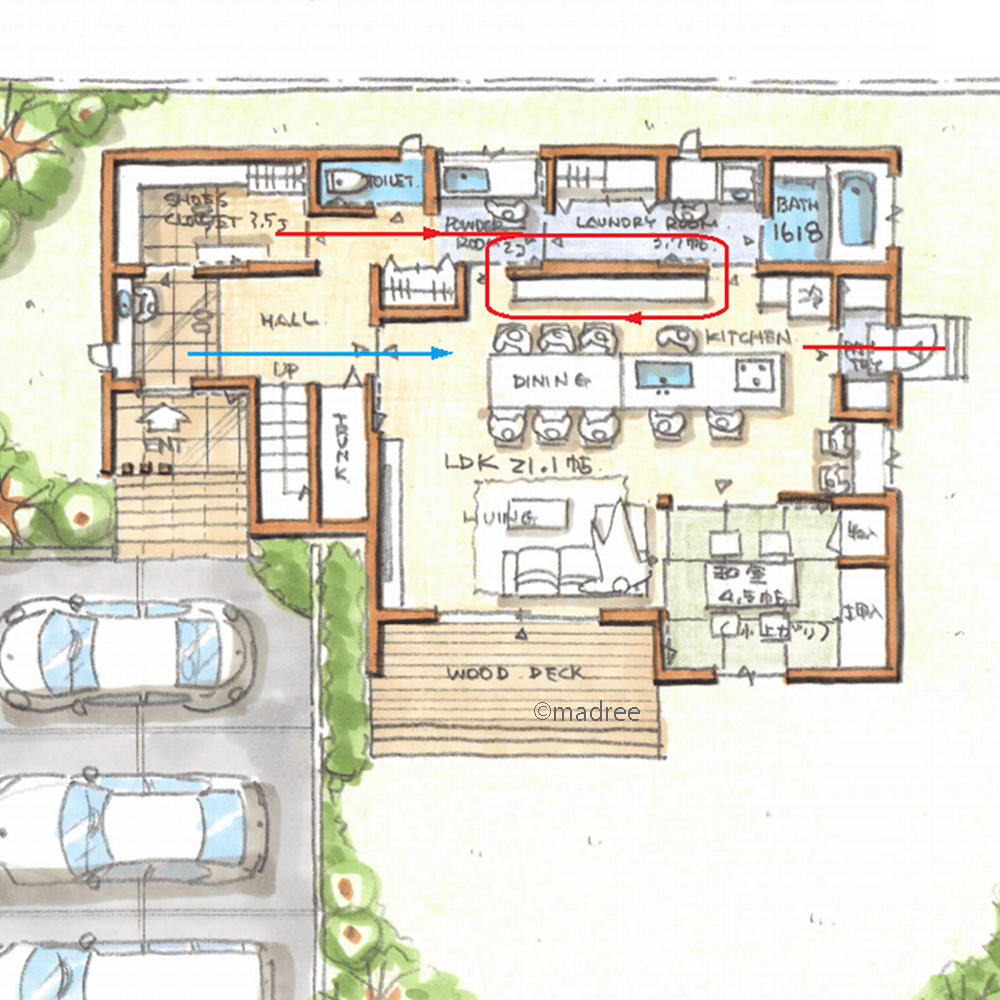 ・キッチンと水廻りを回遊できるように家事動線を計画しました。