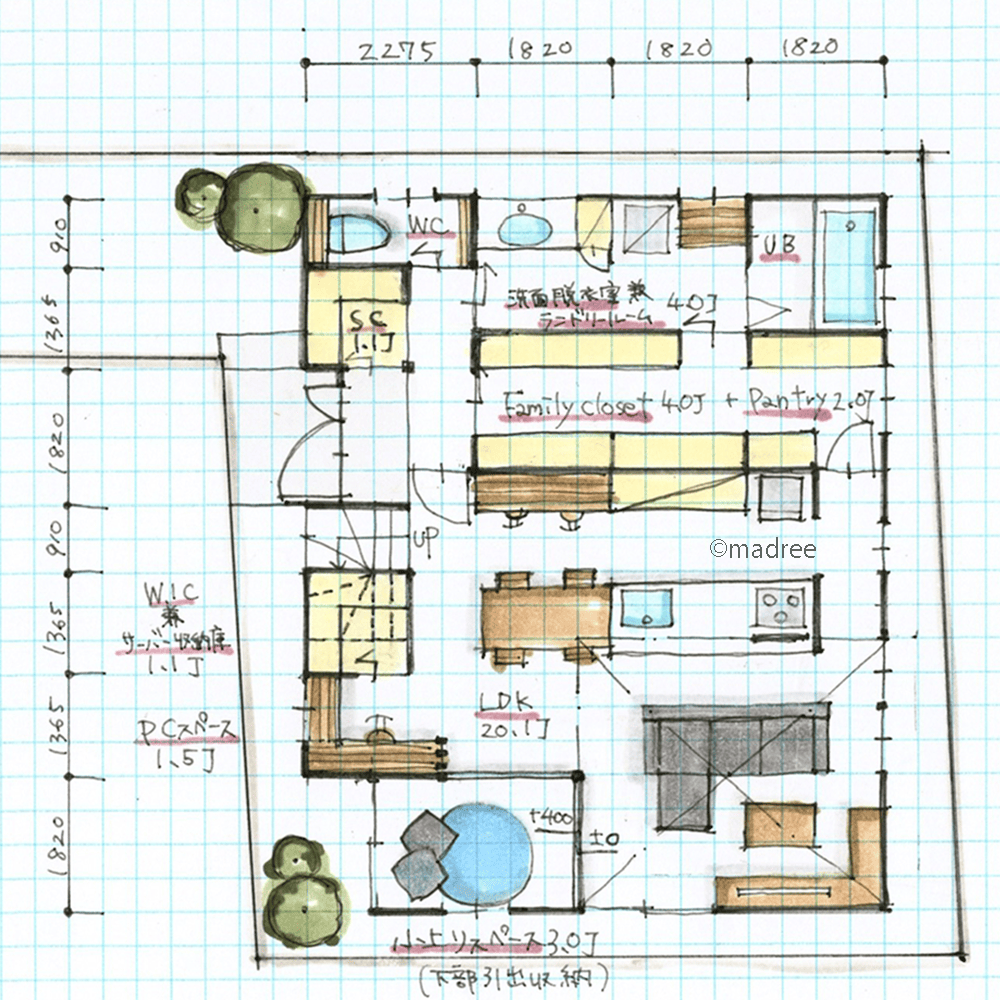 全国の建築家から間取りが集まるmadree(マドリー)で集まった37坪、3LDKの間取りです。リビング吹抜や広く感じるLDKが特徴の注文住宅の間取りです。