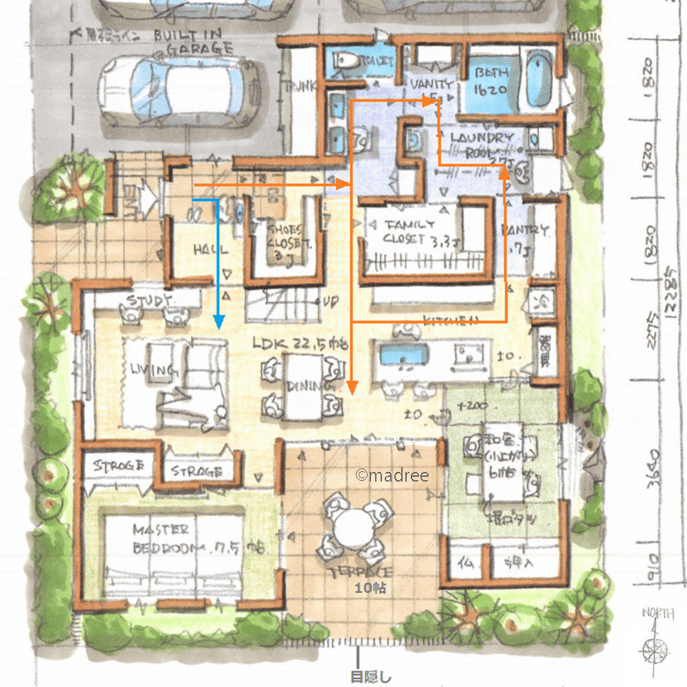 全国の建築家から間取りが集まるmadree(マドリー)で集まった39坪~42坪、2LDKの間取りです。外とつながるLDKやアウトドアリビングが特徴の注文住宅の間取りです。