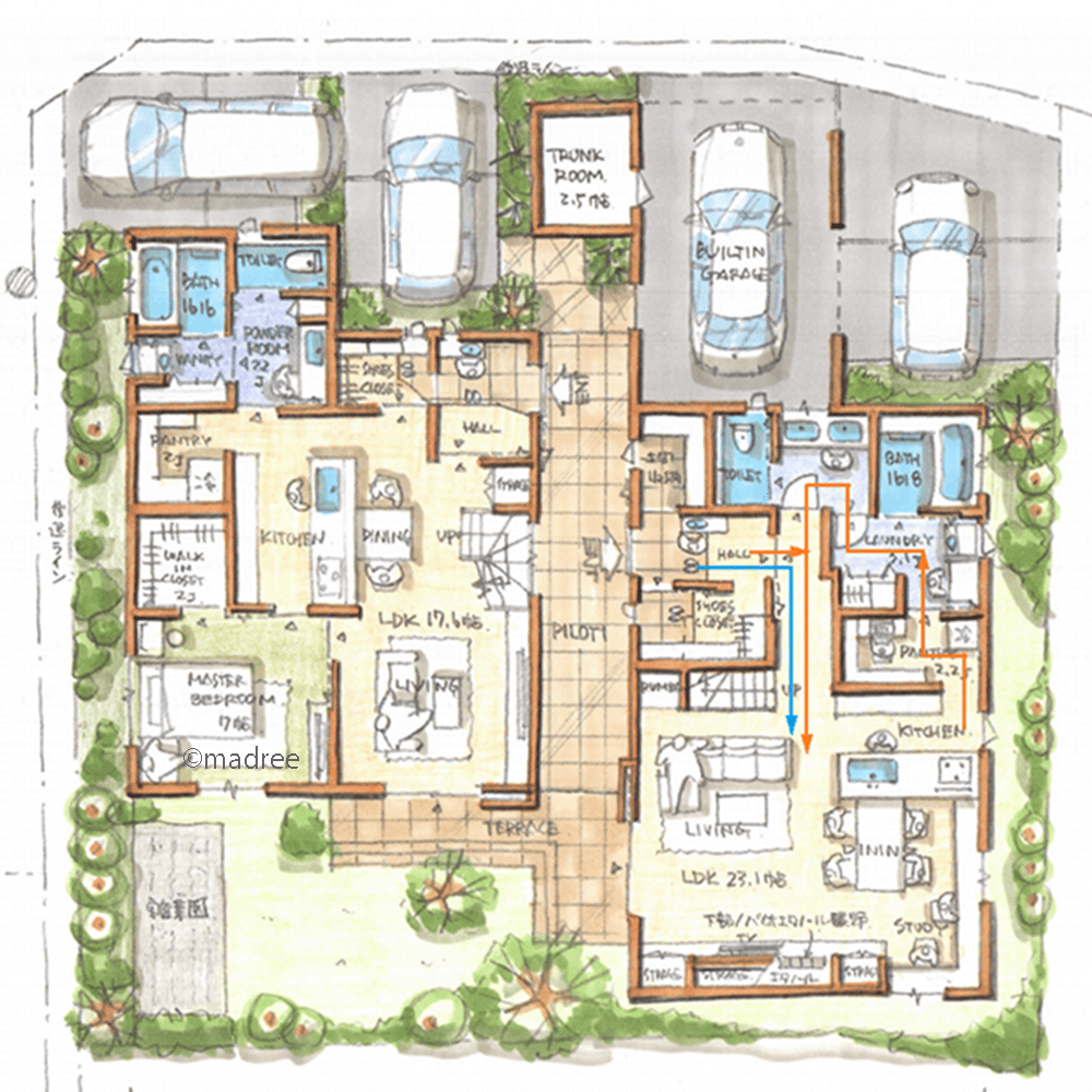 全国の建築家から間取りが集まるmadree(マドリー)で集まった50坪以上、5LDKの間取りです。外とつながるLDKやアウトドアリビングが特徴の注文住宅の間取りです。