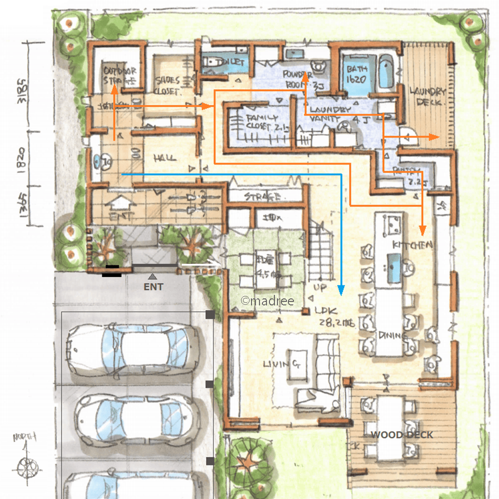全国の建築家から間取りが集まるmadree(マドリー)で集まった52坪、2LDKの間取りです。外とつながるLDKやアウトドアリビングが特徴の注文住宅の間取りです。